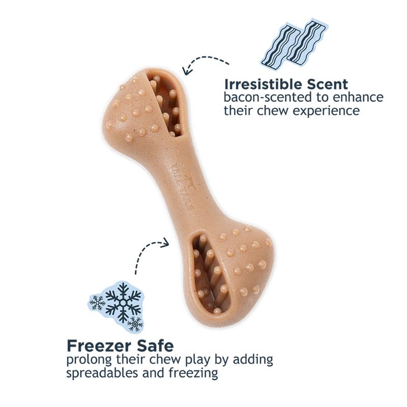 The Tall Tails Freeze and Fill Chew Bone Dog Toy is designed to turn treat time into longer-lasting, enriching play. Simply fill with your dog’s favorite treats and freeze to keep them engaged and satisfied while supporting calm, independent play. Built for dogs who love to chew, this durable toy features a steamed-in bacon scent to capture attention, a rocking shape to encourage active movement, and a textured surface that helps clean teeth and massage gums with every bite. Top-rack dishwasher safe for easy everyday use.